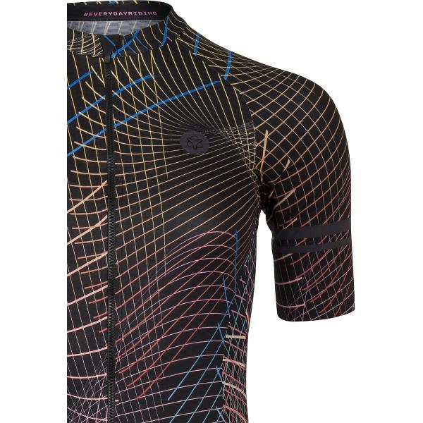 De donkere onderkleur in het design staat voor de zomerse schemeravonden. De lijnen staan voor de kleurrijke wereld overdag. Een zomers fietshirt dat gemaakt is om prestatie en plezier te combineren.
