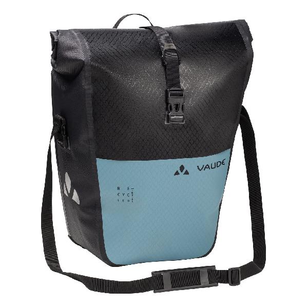 Een enkele fietstas van Vaude van gerecycled materiaal. Deze waterdichte tas voor achterop heeft gelaste naden, 24 liter inhoud, een rolsluiting, reflectie, een schouderband en een gemakkelijk bevestigingssysteem.