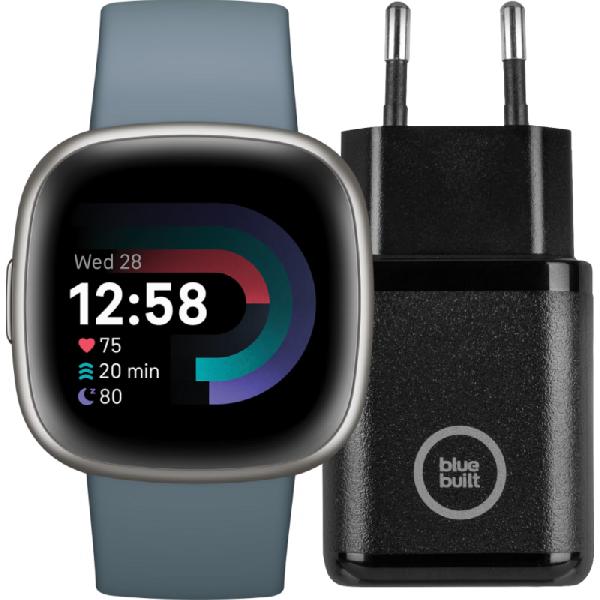 Fitbit Versa 4 Zilver/Blauw + BlueBuilt Oplader