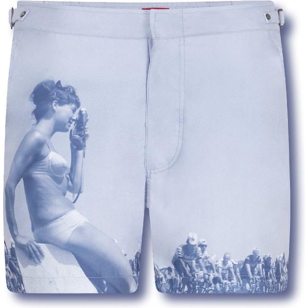 De bermuda heeft een print van een bikini-dragende jongedame die een wielertocht filmt. Sommige renners hebben meer oog voor haar dan voor hun tegenstrevers. Logisch; toegewijde supporters zijn van cruciaal belang voor elke renner.