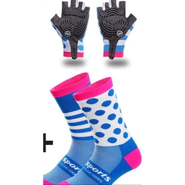 Pakket bevat 1 paar fietshandschoenen en een paar sportsokken. In een originele kleurstelling, roze wit en blauwe bolletjes.