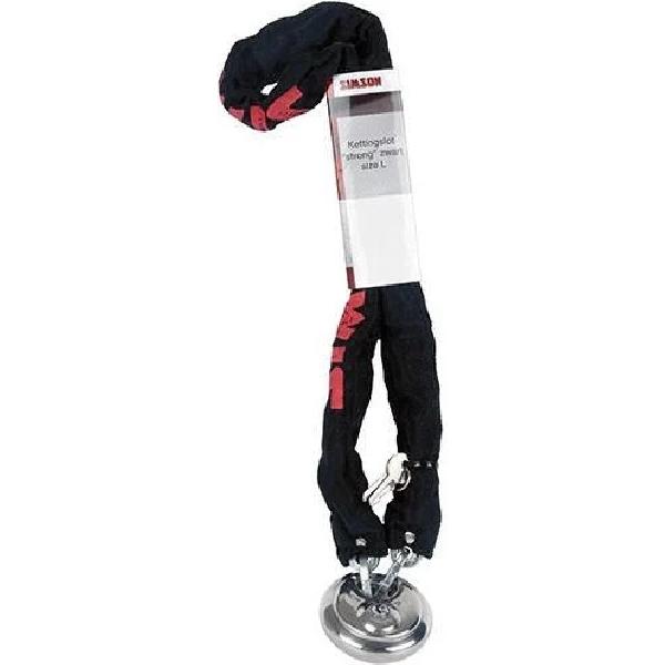 Het Simson Kettingslot Mighty is een zeer sterk zwart kettingslot. De ketting heeft een lengte van 100 cm en kan eenvoudig worden meegenomen door de ketting om de zadelpe....