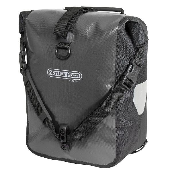 Een set van twee enkele fietstassen van kwaliteitsmerk Ortlieb met een totale inhoud van 25 liter. De compacte tassen met rolsluiting zijn waterproof, met Quick-Lock 2.1 bevestiging voor een voor- of achterdrager.