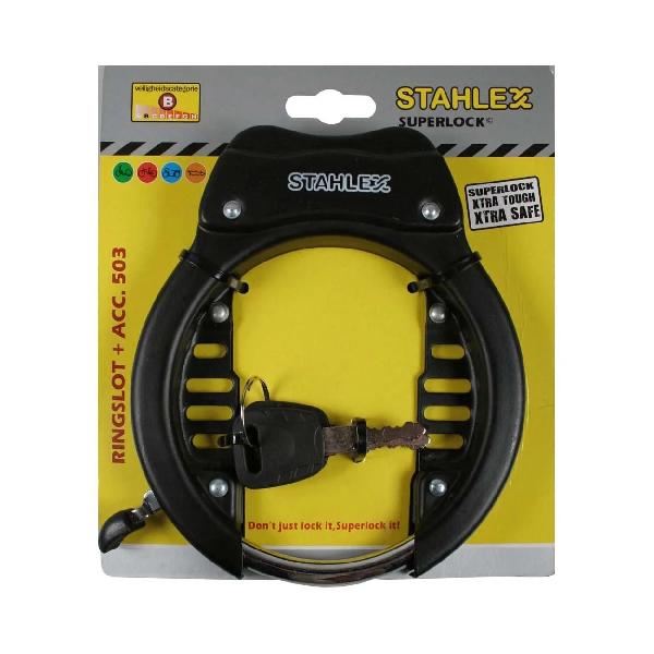Luxe uitvoering van het klassieke Stahlex ringslot voor de alledaagse fiets. Vanwege het geharde staal is dit robuuste fietsslot extra sterk. Inclusief 2 sleutels en bevestigingsmateriaal
