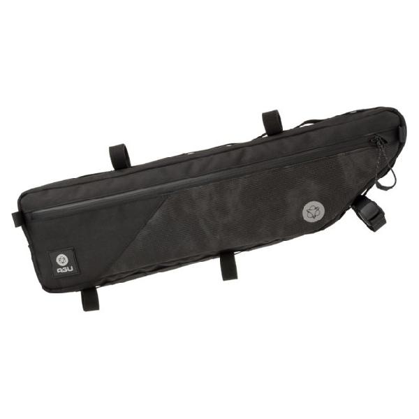 Een zwarte frametas van AGU met een inhoud van 5,5 liter en reflectie. Deze bikepacking tas is waterbestendig en eenvoudig te bevestigen aan de bovenste framebuis.