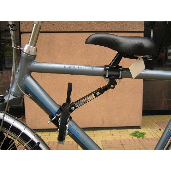De Zadel op Stang nr. 1 is speciaal gemaakt voor op een damesfiets. Ideaal voor iets oudere kinderen tot ongeveer 40 kilo. Compleet met ruggensteun en voetsteunen!
