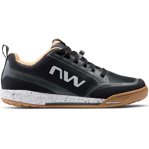 De zool is voorzien van het exclusieve Northwave flat-systeem dat speciaal is ontwikkeld om totale controle te bieden. Het mede ontwikkelde MICHELIN NW-compoundprofiel zorgt voor een ongekende grip op de pedalen Uniek in zijn soort, de adaptieve TPU-schacht met openingen en gekalibreerde stijfheid zorgt voor meer controle en ondersteuning De EVA-tussenzool zorgt voor efficiënte schokabsorptie Slijtvast gelast bovenwerk met grote ademende mesh-inzetstukken Gelast TPU-versterkingen op de teen en hiel voor bescherming tegen stoten Mesh tong met aangepaste vulling combineert bescherming en ademend vermogen Niet-rekbare veters kunnen gemakkelijk worden opgeborgen in de elastische houder