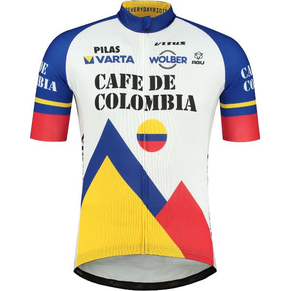 Originele replica van het Café de Colombia wielershirt. Dit wielershirt heeft een volledige rits over de voorzijde van het shirt en 3 zakken op de rug. Daarnaast is het shirt voorzien van een siliconen gripper aan de onderzijde van het shirt. De Café de Colombia wielerploeg was actief in de jaren 1985-1990. Het team werd gesponsord door de Colombiaanse koffietelers van de nationale overheid.