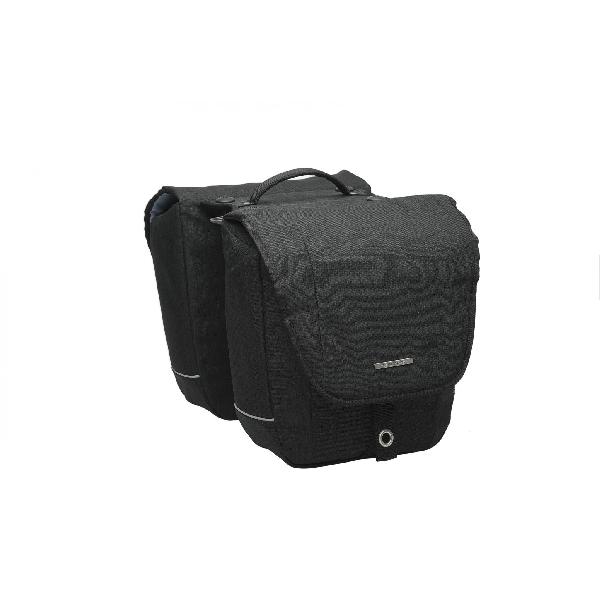 Een degelijke dubbele fietstas met een ruime inhoud van 46 liter. Deze zwarte dubbele Shopper is voorzien van verharde bodemplaten, goede reflectie en eenvoudige bevestiging.