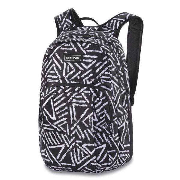 Praktische back to school-rugzak van Dakine met een inhoud van 25 liter en een zwart-witte geometrische print. Met ruime hoofdvakken, organiser, laptophoes, geïsoleerd koelvak, zonnebrilvak en meer!